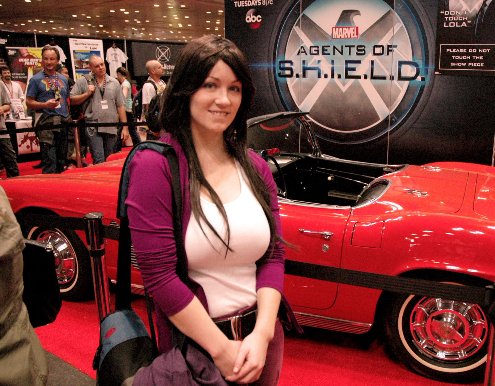 The showroom was chaotic, but that was to be expected. There was something new and interesting going on in every direction. From t-shirt giveaways, to a Walking Dead “house” and scenery, as well as the armed “Walker killer” car that allowed con-goers to go in and take pictures of themselves in action. I did not participate, but it seemed like a blast from the reactions of the fans inside. I did, however, take my picture in front of Lola! For those of you who don’t live by the phrase, “Coulson Lives”, you probably aren’t familiar with Lola. She’s the red hottie in the new hit series ‘Agents of S.H.I.E.L.D’. That’s right, I’m talking about Agent Coulson’s beloved transportation device!