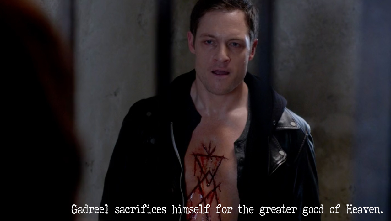 OF COURSE a character that I’m really starting to like gets killed off. However, he went a noble way. He knew that no matter what words both himself and Castiel tried to tell Hannah (one of Metatron’s angel followers) that they wouldn’t listen or believe them. He carved into his chest, gave a speech about heaven, and stabbed himself. All so Castiel can make things right in heaven and rip down Metatron from his God complex.