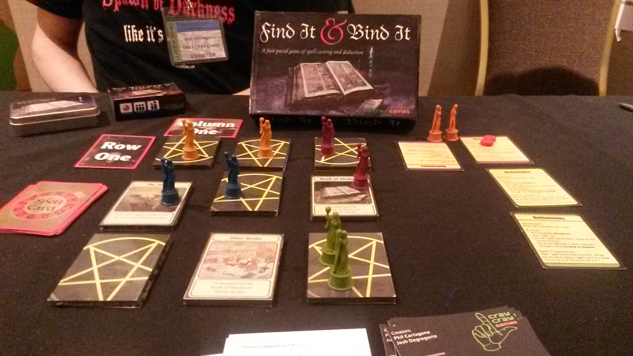I also tried a few games currently on Kickstarter. The first was called “Find It & Bind It” by Cray Cray Games, a strategy game where each player needs to maneuver their two witches to the Book of Shadows first. It’s a quick 30 minute game max.