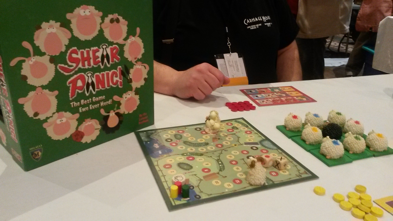 Besides my highlight for the con (and month), I also got to try out some other really interesting games. Next at the top of the list is a really creative and adorable board and strategy game named “Shear Panic!” by Mayfair Games where players try to arrange a flock of sheep in advantageous positions. I know. It sounds lame. I’m getting this game. It’s super fun and I highly recommend it.