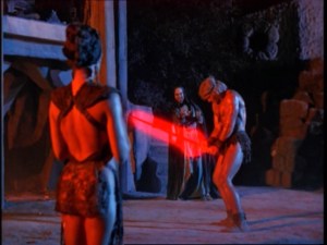 - We get a brief intro to the lair of Munkar, along with his grotesque little puppet pet who eats people. We also get to see these wonderful (crap) sets up close. I mean…oof, I’ve seen better “castle walls” at the local Renaissance Faire. Also, like 5 pair of bewbs…and Barbi Benton. No idea what’s going on at this point.